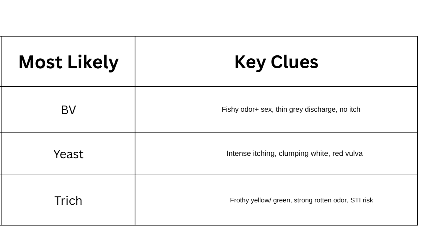 BV: Fishy, gray, no itch. Not STI.